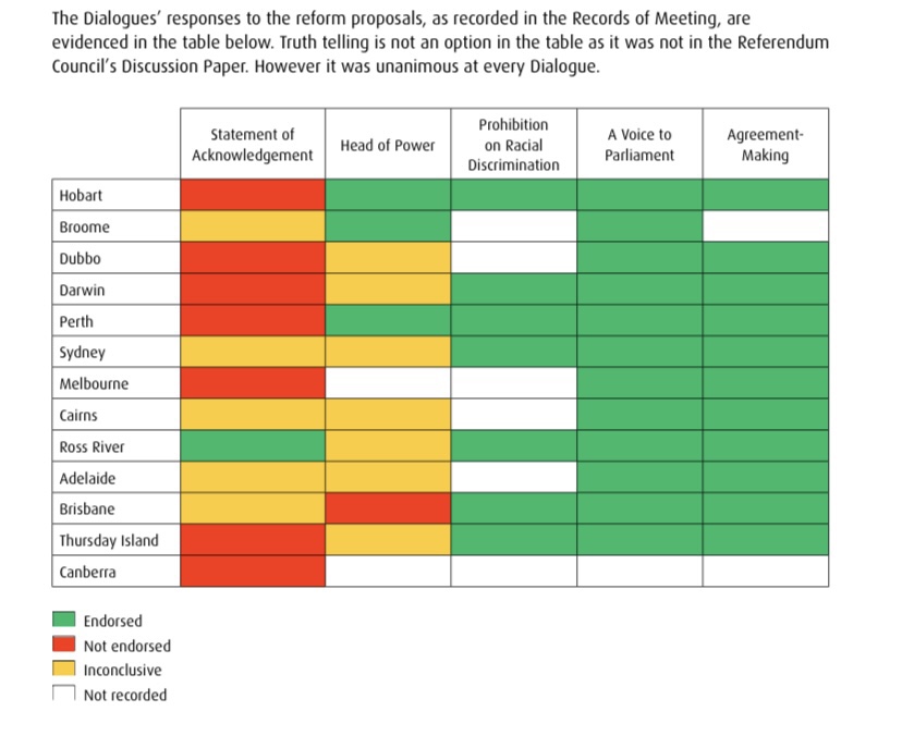 - Of concern to me was the fact that the table on page 15 under the heading of ‘Outcomes’ shows responses to various reform proposals; the prohibition on racial discrimination was endorsed at a majority of the Regional Dialogues (7 of 12) and rather than being ‘not endorsed’ or ‘inconclusive’, the remaining five were ‘not recorded’, which makes one wonder about the transparency of these deliberations and whether the recording of the remaining five might have brought the result into line with the Voice option.